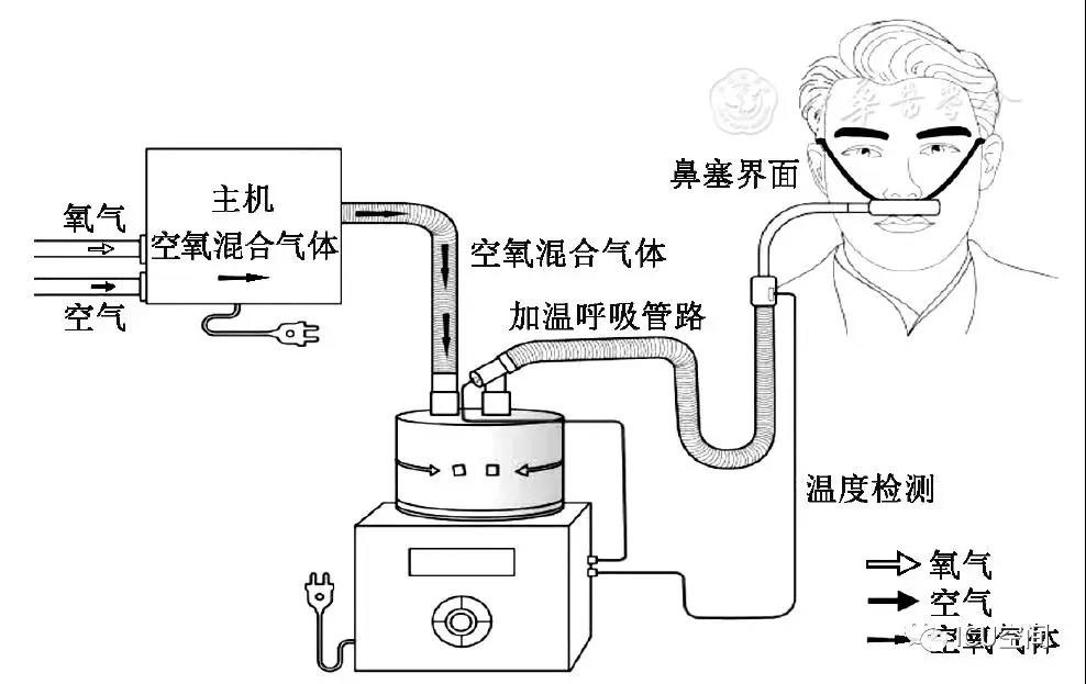 HFNC是指一種通過高流量鼻塞持續(xù)為患者提供可以調(diào)控并相對恒定吸氧濃度(21%~100%)、溫度(31~37 ℃)和濕度的高流量(8~80 L/min)吸入氣體的治療方式。該治療設(shè)備主要包括空氧混合裝置、濕化治療儀、高流量鼻塞以及連接呼吸管路[3]。結(jié)合國內(nèi)和國際通用命名習(xí)慣,本共識統(tǒng)一采用"經(jīng)鼻高流量濕化氧療"進行表述,英文簡稱為HFNC(圖1)。