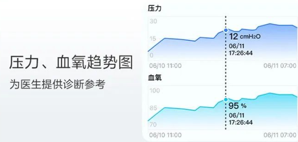 - 準(zhǔn)確識(shí)別 OA,CA,H,LL 等呼吸事件,智能調(diào)節(jié)提供更舒適呼吸體驗(yàn)。